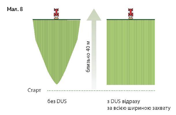 Просто кажучи, система DUS дозволяє відразу розпочати обприскування за всією шириною захвату. До того ж регулювання тиску попереджує утворення в трубках відкладень та засмічень. Завдяки тому, що концентрація розчину в системі трубопроводів до форсунок лишається постійною, то обприскування можна розпочати без проблем, наприклад, після заміни препарату. Більше того, під час очищення трубок до форсунок не потрібно проводити обприскування: концентрований робочий розчин повертається через систему постійної циркуляції до основного баку (мал.9).