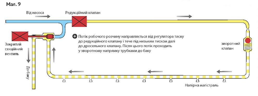 Крім того, самохідний обприскувач може бути оснащений системою постійної циркуляції (DUS). «Головне завдання DUS — це регулювання тиску в усій системі, — уточнює Валерій Смолін. — Вона працює так. Починаючи роботу, магістраль вмикає трубки обприскування та під низьким тиском заповнюється розчином в зворотному порядку. Таким чином трубки на всій ширині захвату постійно заповнені та готові до роботи, а прохід полоси відбувається без зупинок. Все це здійснюється завдяки регулювання тиску»(мал.8).