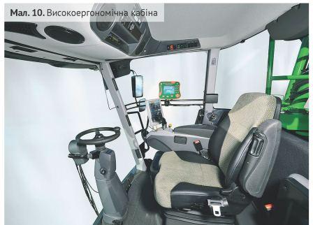 Окремої уваги заслуговує кабіна Claas Vista-Cab. Вона дуже простора й затишна, виконана без зайвого пафосу та з максимальним наголосом на зручність і практичність. Завдяки великій площі скління гарний огляд забезпечується на всі боки. При цьому переднє та заднє скло мають сонцезахисну сітку. Для збереження здоров’я оператора кабіна оснащена обігрівачем, якісним повітряним фільтром і має гарну звукоізоляцію та клімат-контроль. (мал. 10)