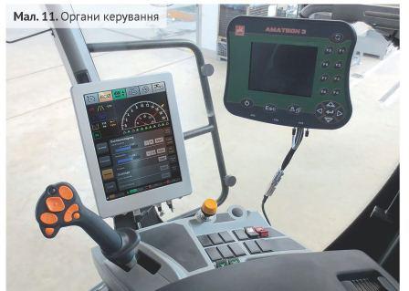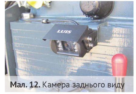 Керування двигуном та двома модусами, увімкнення шасі та штанг, регулювання ширини колії, частоти обертання насосу, вмикання круїз-контролю — все це робиться на великому сенсорному дисплеї AMADRIVE. Крім того, на ньому відображається інформація щодо швидкості руху та кількості обертів двигуна і його температури, рівня палива та результати діагностування двигуна та гідросистеми. «У нас також стоїть камера заднього виду, — показує на невелику камеру Олександр Миколайчук. — Річ незамінна. Вона охоплює 135°, завдяки інфрачервоній техніці нічного бачення показує чітке зображення навіть вночі» (мал. 12).