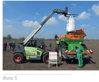 Після оцінки роботи сівалки EDX-6000TC перед відвідувачами постав останній тандем: трактор Arion 640C та перший в Україні причіпний розкидач добрив із диференційованим внесенням ZG –TS 8200. Із заповненим біг-бегами з мінеральними добривами причепом під’їжджає старенький 175-сильний Ares 826RZ. До нього, налаштувавши телескопічну стрілу, наближається навантажувач Scorpion 6030 CP. Ця машина вантажопідйомністю до 3 т і стрілою на 6,5 м оснащена двигуном Deutz потужністю 80/100 кВт/к.с. Головні переваги навантажувача скриті в його конструкції. Так, завдяки низькому розміщенню щогли було досягнуто рівномірний розподіл ваги, гарний огляд та низький центр тяжіння. Крім того, малий радіус повороту (3,6 м) робить його дуже маневреним. З розрізаного над кузовом розкидача біг-бегу висипаються добрива (фото 5).