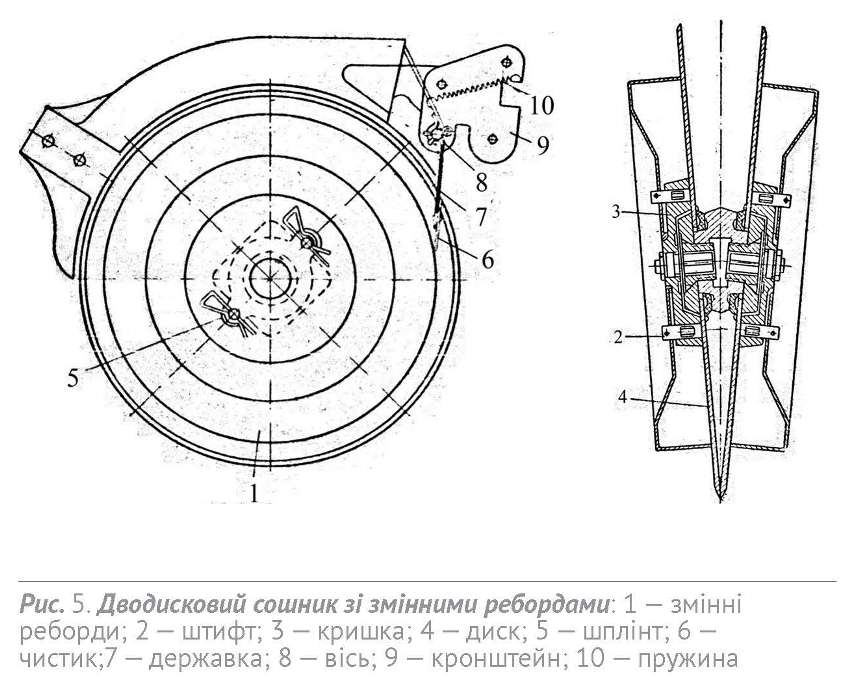 Для зменшення нерівномірного загортання насіння по глибині рядка, причинами якого є попадання частини насіння на внутрішні поверхні дисків, після чого воно ними відкидається відцентровими силами в різні боки, в тому числі і на денну поверхню ґрунту, в нижній частині сошника між дисками було запропоновано встановити нерухому п’ятку різних конструкцій, до бічних сторін якої прикріплюються щоки, що утворюють горловину для проходження насіння до дна борозни. Щоки в задній частині зрізані під деяким кутом. Насіння з напрямника сошника попадає безпосередньо в міжщоковий простір і далі на дно борозни, не торкаючись рухомих дисків.