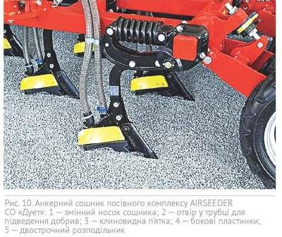 Посівний комплекс AIRSEEDER CO — анкерна сівалка нового покоління, яка виконує підготовку ґрунту, сівбу та внесення добрив за один прохід, обладнується модернізованими анкерними сошниками, передня частина яких дообладнується спеціальним наральником з гострим кутом входження у ґрунт та додатковим крильцями (рис. 9.).