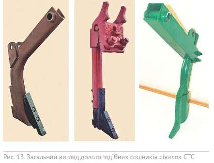 Оригінальну і досить просту конструкцію мають сошники для прямого посіву сівалками СТС. Він обладнаний оборотним долотоподібним наральником (рис. 13).