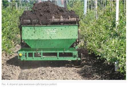 Для внесення сипкого матеріалу у пристовбурні смуги в ІС НААН розроблена машина, яка монтується на серійний розкидач органічних добрив РОУ-6 (рис. 4) і включає приймальний бункер із дозувальним пристроєм, стрічковий поперечний транспортер і механізм його приводу. Субстрат планчатим транспортером розкидача подається у приймальний бункер, звідки надходить на стрічковий транспортер, який переміщує його у пристовбурну смугу ряду дерев, утворюючи при цьому поздовжній валок. Залежно від ширини міжрядь стрічковий транспортер можна переміщувати в поперечному напрямку щодо поздовжньої осі агрегату.