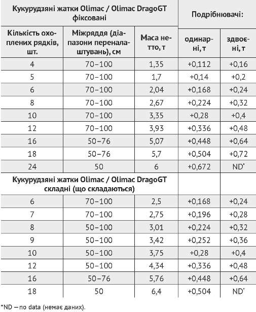 Компанія Olimac S.r.l. випускає кукурудзяні жатки з можливістю переоснащення під збирання соняшнику і бобових культур, під власними брендами Olimac i Olimac Drago (італ. «Дракон») GT (Grande Tecnologia) / DragoGT, які входять до світової групи елітних універсальних виробів подібного класу. Жатки Olimac i Olimac Drago GT (DragoGT) фіксовані й складні, постійно вдосконалюються. У таблиці відображено реальний стан справ із виробничою програмою компанії Olimac S.r.l. і випуском однойменних конкретних моделей жаток для збирання, як виявилося, качанів, кукурудзяного зерна, бобів, соняшникових дозрілих кошиків i насіння, при чому без критичних втрат.