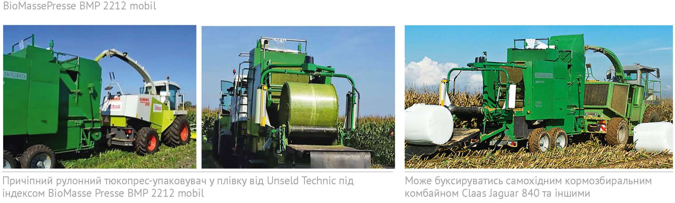 До першого варіанту належить німецька машина BioMassePresse BMP 2212 mobil на тандемному ходу виробництва німецької компанії Unseld Technic GmbH & Co.KG з міста Лангенау (район Альб-Дунай, адмін. Округ Тюбінген, земля Ваден-Вюртемберг, ФРН; unseld-technic.de), яка під час роботи буксирується і завантажується самохідним кормозбиральним комбайном Claas Jaguar 840, який впорскує у вихідну зі свого силосопроводу подрібнену кормову масу рідину для консервування.