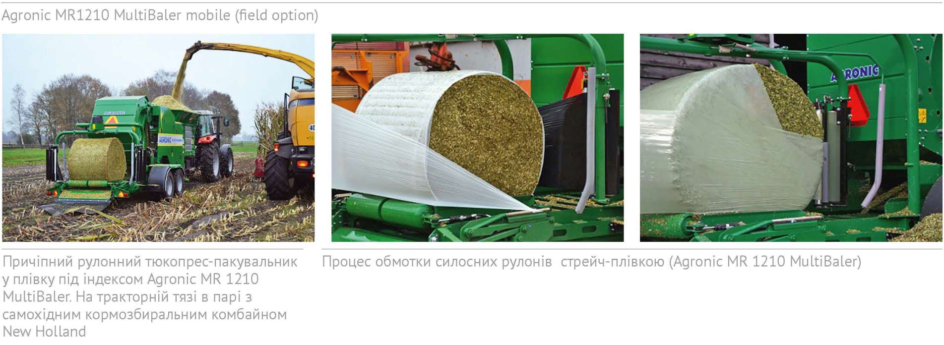 Мобільний варіант Agronic MR1210 MultiBaler обгортає 40–50 рулонів на годину і використовується у комбінації з кормозбиральним комбайном, що дозволяє істотно скоротити витрати на логістику. А додаткові опції роблять машину ще більш багатофункціональною.