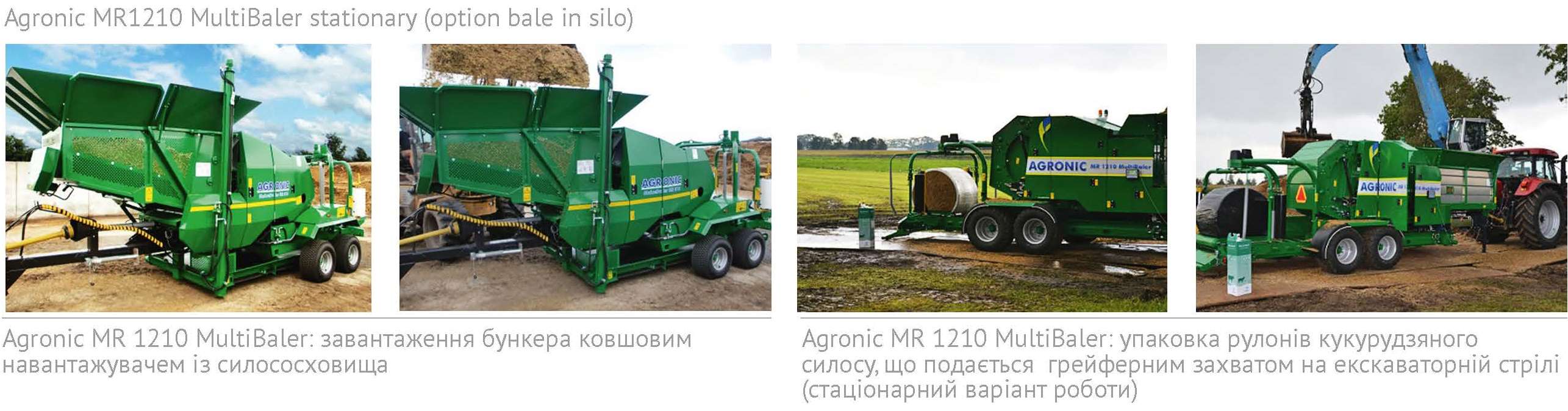 Це перш за все досить продуктивна і поширена в світі модель Agronic MR1210 MultiBaler. Вона буксирується трактором і за зовнішнім виглядом та способом завантаження сильно нагадує гуркіт — громіздкий агрегат для поділу сипучих матеріалів за розмірами шматків або частинок (фракцій). І за рахунок фуражу, пресованого в тюки завдяки «Агронік» MR1210 (Ø х Ш = 1–1,2 х 1 м; 0,65–1 т), багато тваринницьких господарств отримують солідну надбавку у виробництві молока і м’яса.