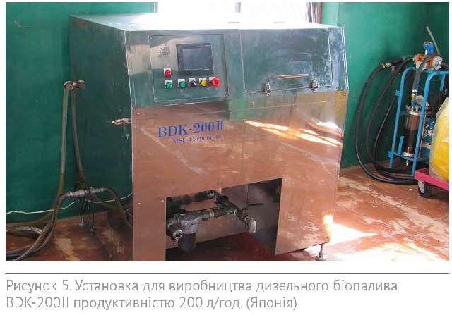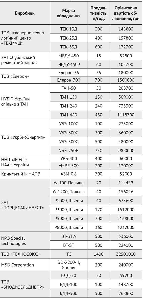 В Україні існують підприємства, які виробляють обладнання для виробництва дизельного біопалива або продають імпортне устаткування різної продуктивності із застосуванням автоматизації і без неї, а також використовують дешеві чи дорогі матеріали, що впливає на вартість обладнання (табл. 1).