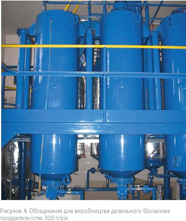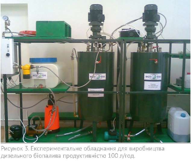 Паралельно з цим у НУБіП України була розроблена експериментальна установка для виробництва дизельного біопалива продуктивністю 100 л/год. (рис. 3) та на її базі була виготовлена промислова установка продуктивністю 300 т/рік (рис. 4), у яких перемішування відбувається за допомогою механічної лопатевої мішалки. Недоліком цього обладнання та попередніх варіантів є використання під кожний етап виробництва палива окремої ємності з допоміжним устаткуванням, крім того, порівняно з установкою УВМЕ-1000, перемішування відбувається за допомогою лопатевої мішалки, а не рамкової.
