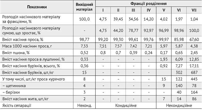 Вихідний матеріал після сепарації елітного насіння проса на повітряно-решітно-трієрних робочих органах зерноочисних машин не відповідав вимогам ДСТУ за вмістом насіння бур’янів — 0,36% (15,0 шт./кг), у тому числі: щетинника — 4,0 шт./кг, проса курячого — 8,0 шт./кг; берізки — 3,0 шт./кг; насіння інших культурних рослин: пшона — 0,52%, жита — 2,0 шт./кг, проса в лусках — 0,33%, а вміст насіння основної культури становив — 98,77%.