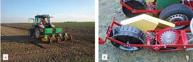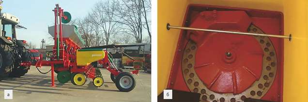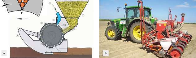Рис. 4. Загальний вид (а) та висівний апарат (б) сівалки Вега 8