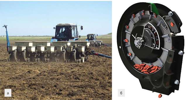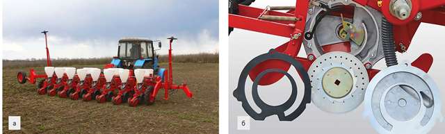 Рис. 1. Загальний вид (а) та висівний апарат (б) сівалки S-100