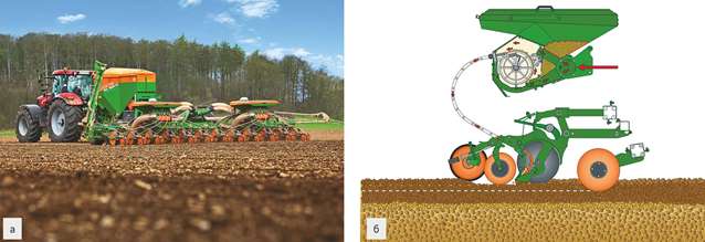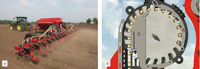 Рис. 2. Загальний вид (а) та висівний апарат (б) сівалки Gamma