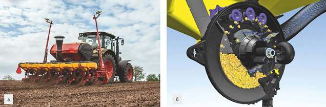 Рис. 3. Загальний вид (а) та висівний апарат (б) сівалки KINZE3000 Twin Lene