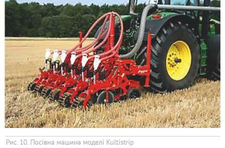 Для сівби кукурузди за технологією strip-till фірма Kverneland виготовляє посівну машину моделі Kultistrip (рис. 10), яка обладнана грунтообробними робочими органами для стрічкового обробітку грунту. Насіння висівається в оброблені стрічки грунту. Застосування цієї технології дозволяє досягти більшої ефективності, зниження витрат виробництва і запобігання ерозії грунту.