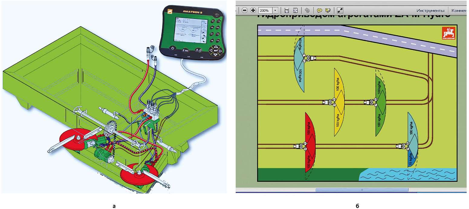 Компанія AMAZONE комплектує розкидачі добрив гідравлічним приводом розкидних дисків моделі ZA-M Hydro терміналом AMATRON3 (рис. 1а). Розкидач добрив цієї моделі оснащується зважувальним пристроєм. Основною перевагою такої системи приводу є змінна регульована ширина захвату на краях і клиновидних ділянках поля (рис. 1б). Програмоване безступеневе вимикання секцій запобігає надмірному або недостатньому внесенню добрив на великих площах.