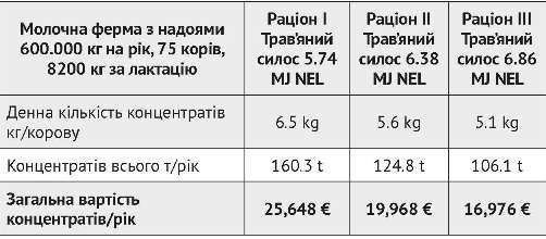 Тому дуже важливо в кожному господарстві знайти оптимальне співвідношення об’ємистих кормів, так би мовити «домашнього виробництва», та концкормів. Дослідження показали, що частку концентратів можна знизити на 20–30% без втрати продуктивності за умови високої якості об’ємистих кормів.