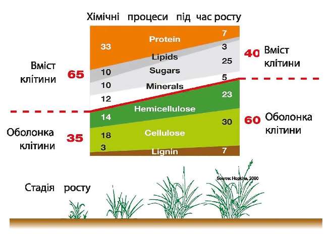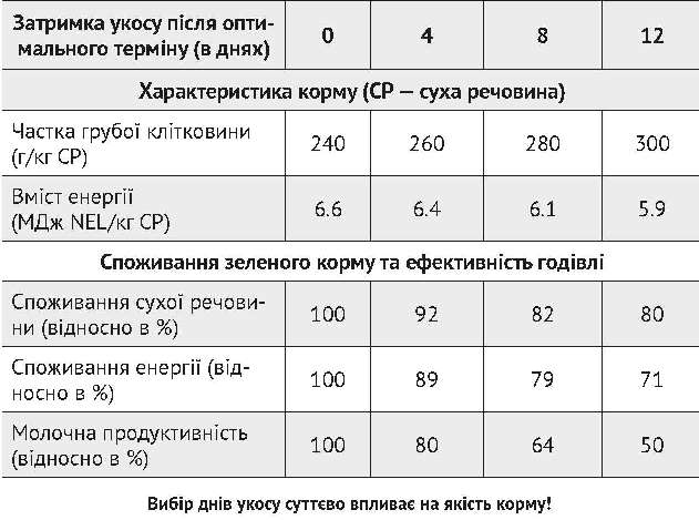 З розвитком рослини відбуваються зміни в її структурі та хімічному складі. В клітині зменшується вміст таких речовин, як протеїн, ліпіди, цукор та мінерали, в той час, як частка складових стінки клітин (а саме геміцелюлози, целюлози та лігніну) зростає. В результаті погіршуються енергетична цінність корму, обсяг його споживання, легкотравність та засвоюваність. Ось чому для отримання оптимального вмісту енергії та поживних речовин у кормі важливо не тільки підібрати склад кормових рослин, але також правильно визначити та дотриматись часу укосу. При затримці укосу корму на 8 днів від оптимального терміну надої зменшуються на третину, а при 12 — вдвічі! Економити на якості, надійності, продуктивності та кількості косарок або косарок-плющилок — це те саме, що економити на кормах. Розплата у вигляді різкого зниження надоїв не забариться!