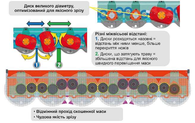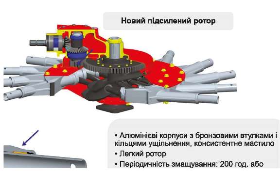 - колеса з широким профілем для зменшення тиску мають бути розташовані якомога ближче до робочої зони, зубці виконані асиметричними, а пальцеві муфти, що передають крутний момент, дозволяти надійний підйом та складання секцій без вимкнення ВВП.