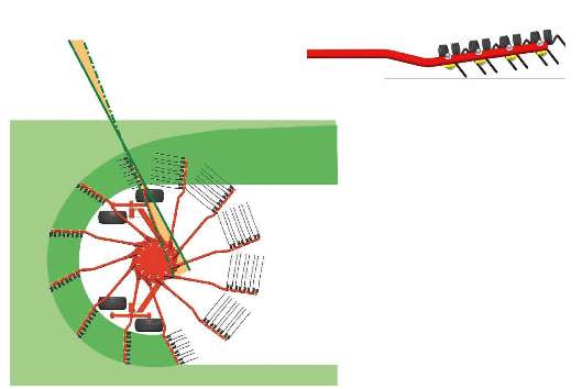 Також KUHN пропонує валкоутворювачі пасивного типу «сонечко» або роторні (одно, двох та чотирьох) з боковим чи центральним укладанням валка. Боковими валкоутворювачами можна здвоювати валки при проході вперед та назад, а центральний валок є найкращим для прес-підбирача. Надзвичайно важливою для повного та швидкого підбирання корму й утворення щільного якісного валка є форма граблин із вигином, як це робить KUHN (мал. 7), що дозволяє більшою мірою відкидати траву вбік під час валкування.