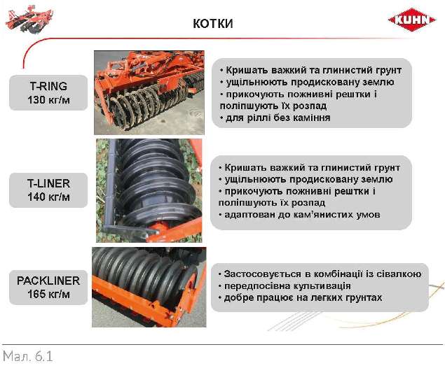 У широкозахватних причіпних моделях, залежно від виду роботи, грунту та типу рослиних решток, використовується три типи котків діаметром 600 мм, характеристики та основні особливості застосування наведені на мал. 6.1.