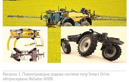 Самохідні обприскувачі RoGator 600В (Challenger) укомплектованні повнопривідною ходовою системою типу Smart Drive (рис. 1) із гідростатичним приводом, яка включає датчики швидкості на кожному колесі. Гідростатичний насос із датчиком навантаження монтується безпосередньо на двигун. Завдяки такій конструкції гідростатична система обприскувача забезпечує дотримання робочої швидкості, без перемикання передач: водій вибирає швидкість руху, і машина працює на заданому режимі, незалежно від рельєфу та грунтових умов поля.