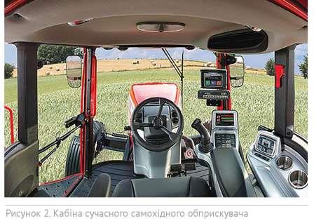 Самохідні обприскувачі оснащуються комфортабельними кабінами, що дозволяє значно підвищити ефективність роботи механізатора (рис. 2). Робоче місце його обладнане комфортним сидінням, виготовленим із якісних матеріалів (а під замовлення і шкіряним). Велика площа скління у задній і передній дозволяє механізатору контролювати передні колеса при роботі по міжряддях та безперешкодно бачити кінці розкладених штанг та інші частини машини. Кабіни комплектуються системами клімат-контролю із фільтрацією через фільтр із вугільним наповнювачем та надлишковим тиском повітря у салоні. Відеокамера заднього виду дозволяє спостерігати за подіями ззаду обприскувача (при русі назад або вперед). Джойстик служить як акселератором, так і перемикачем передач КПП. Крім того, на ньому розташувалися кнопки керування круїз-контролем, вимикання і вмиканням обприскування, а також регулюванням висоти крайніх секцій штанги.