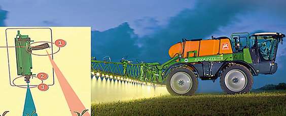 Фірма AMAZONE представляє інтелектуальну систему сенсорних форсунок AmaSpot (рис. 7), яка складається із флуоресцентного датчика GreenSense 1 для визначення наявності бур’янів на полі та високоточної форсунки. Якщо датчик визначив наявність рослини на площі під ним, автоматично включається у роботу форсунка. За твердженням виробника, застосування інтелектуальної системи сенсорних форсунок AmaSpot дозволяє зменшити внесення пестицидів на 20–60%.