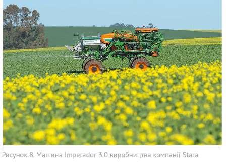 Бразильська компанія Stara пропонує машину Imperador 3.0 (рис. 8), що представляє собою самохідне шассі, яке оснащене обприскувачем із центральним розташуванням штанги та розкидачем мінеральних добрив. Машина може застосовуватись для поверхневого внесення добрив та засобів захисту. Таке конструкційно-компоновочне рішення дає можливість ефективно обробляти поля при більш низьких експлуатаційних витратах, тому що для виконання двох різних технологічних операцій використовується одна машина.