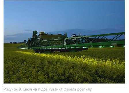 Обприскувачі оснащуються системою підсвічування факела розпилу (рис. 9) за допомогою сучасних LED-діоди, які водонепроникні і практично не потребують обслуговування. У темний час доби оператору добре видно роботу кожного розпилювача, оскільки кожен факел розпилу освітлений по всій ширині захвату штанги. Оператор може своєчасно реагувати при засміченні форсунки, тому що зникає факел розпилу, який повинен бути освітлений. На кінцях штанги встановлено підсвічування для впізнання перешкод і кругове освітлення. При роботі вночі перешкоду видно вже на відстані 20 м.