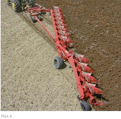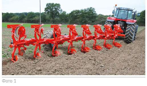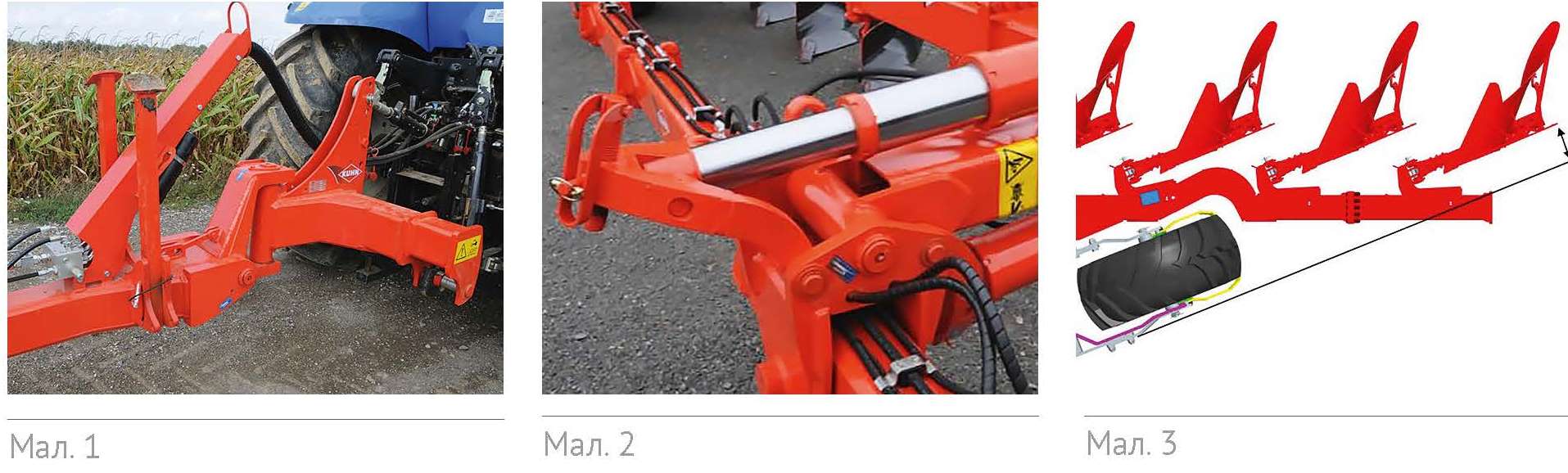 Плавний оборот плуга вперше забезпечується двома телескопічними гідроциліндрами (мал. 2). Вертикальність його регулюється без інструменту двома гвинтами з рукоятками (зліва на мал. 2). Так само просто без інструментів відбувається налаштування глибини оранки (фіксуючими прокладками-кліпсами на гідроциліндрі підйому) і ширини (зсуву вбік). Зазначимо, що опційно ширина зсуву може регулюватись гідравлікою. Для поліпшення стійкості плуга в транспортному положенні та захисту конструкції на поганих дорогах гідроциліндр підйому укомплектовано гідро-пневматичною підвіскою.