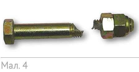 Для захисту робочих органів, стійок та рами від надмірних навантажень, які виникають під час роботи на полях із камінням, важким чи переущільненим грунтом, або які є наслідком нерівномірного, з ривками руху трактора, всі плуги KUHN комплектуються одним із двох типів запобіжників: болтовими «на відрив» Т чи гідравлічними беззупиночними NSH. Болтові «на відрив» запобіжники (мал. 4) є винаходом KUHN і на відміну від традиційних «на зріз» розташовуються не впоперек, а у напрямку руху. Зусилля спрацювання на вістрі долота становить 4000 кГ. Вісь болта, що спрацьовує на відрив, співпадає із напрямком сили, діючої на корпус плуга, і тому при спрацюваннях вони не розбивають отвір та легко замінюються. Глибина оранки залишається стабільною. Не клинить болти, як при зрізанні — не ламаються стійки. Таке дуже просте технічне вдосконалення надзвичайно поліпшило надійність роботи і якість оранки.
