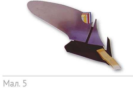 Вирішальним для надійної, тривалої роботи полиці і її грудини є технологія виготовлення. На відміну від багатьох інших виробників, KUHN використовує триплексний матеріал із шарами нерівної товщини (мал. 5). Верхній шар металу має товщину 3,3 мм і твердість 900 вікерсів, середній із м’якого сплаву — 2,3 мм, і нижній твердий — 1,5 мм. Триплексна сталь із неоднаковими товщиною та твердістю шарів збільшує період їх зносу на 40-100% і забезпечує надійну роботу в умовах змінних динамічних навантажень. Навіть при появі тріщин на верхньому шарі відвал продовжує відмінно працювати завдяки зчепленню із середнім шаром, який є більш пластичним.