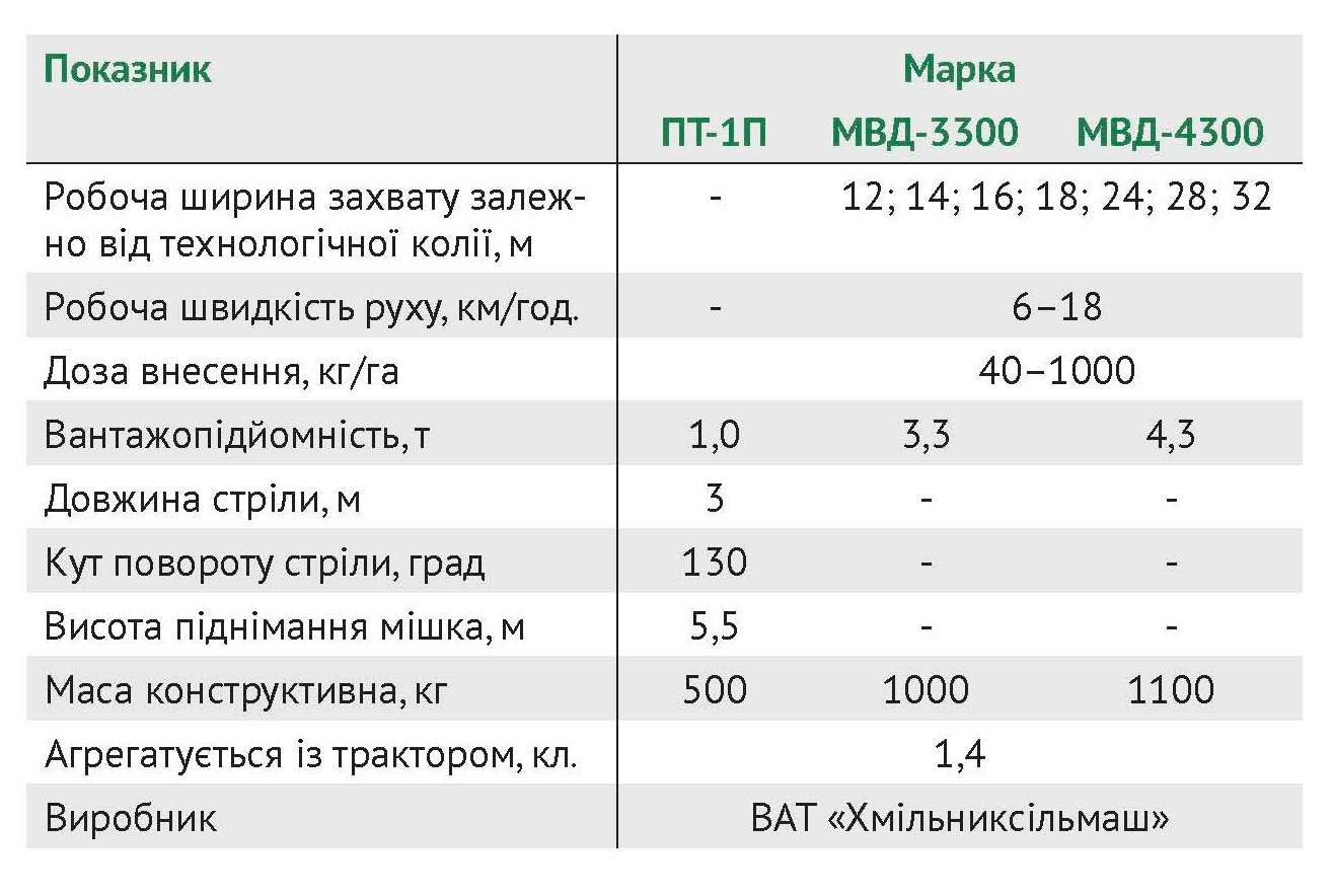 За подібною технологією працює підіймач тракторний поворотний ПТ-1П вітчизняного виробництва. Він може використовуватись самостійно і разом з сучасними машинами для внесення мінеральних добрив МВД-3300 і МВД-4300 (табл. 5). Підіймач має вантажопідйомність 1000 кг. Великогабаритний мішок з добривами піднімається з кузова транспортного засобу і переноситься у кузов машини для внесення добрив. На дні кузова вертикально встановлено ніж, який розрізає мішок і добрива висипаються.