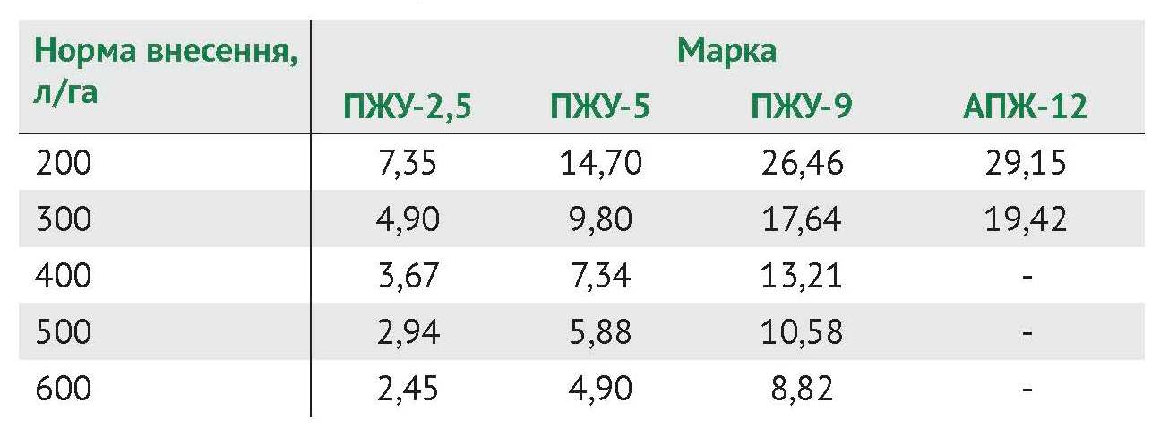 Основний спосіб руху агрегатів при внесенні добрив – човниковий. Довжина робочого гону повинна бути кратною запасу ходу підживлювача (табл. 8).