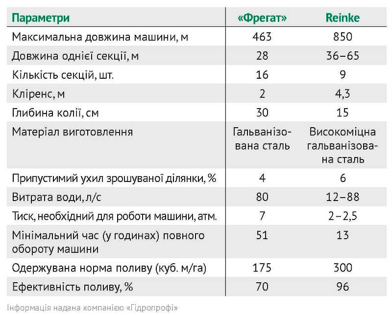 Компанія «Рейнке» (Reіnke), заснована 1954 року в США, є одним із найбільших у світі виробників зрошувальних установок кругового й фронтального типу й має близько 120 дилерів у багатьох країнах, включаючи й Україну. Вона от уже 50 років виготовляє дощувальні машини під зухвалим гаслом: «Краще дощу». Це не хвастощі. На відмінну від багатьох старих дощувалок, які при поливі розмивають ґрунт, будь-яка машина Reіnke створює ефект дощу, згенерована нею волога добре всмоктується. Порівняння, наприклад, технічних даних старої вітчизняної системи поливу «Фрегат» і машин Reіnke можна знайти в табл. 1.