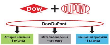 Провідна глобальна односегментна аграрна компанія, яка поєднає бізнеси засобів захисту рослин та насіння компаній Дюпон та Дау. Об’єднана компанія матиме найбільш повний та різноманітний портфель і стійкий канал руху товарів з винятковими можливостями зростання у найближчому, подальшому та більш далекому майбутньому. Додаткові пропозиції двох компаній забезпечать фермерські господарства у всіх куточках світу широким портфелем продуктів, рішень та більшим вибором. Об’єднана проформа прибутку для сільського господарства приблизно $19 млрд.