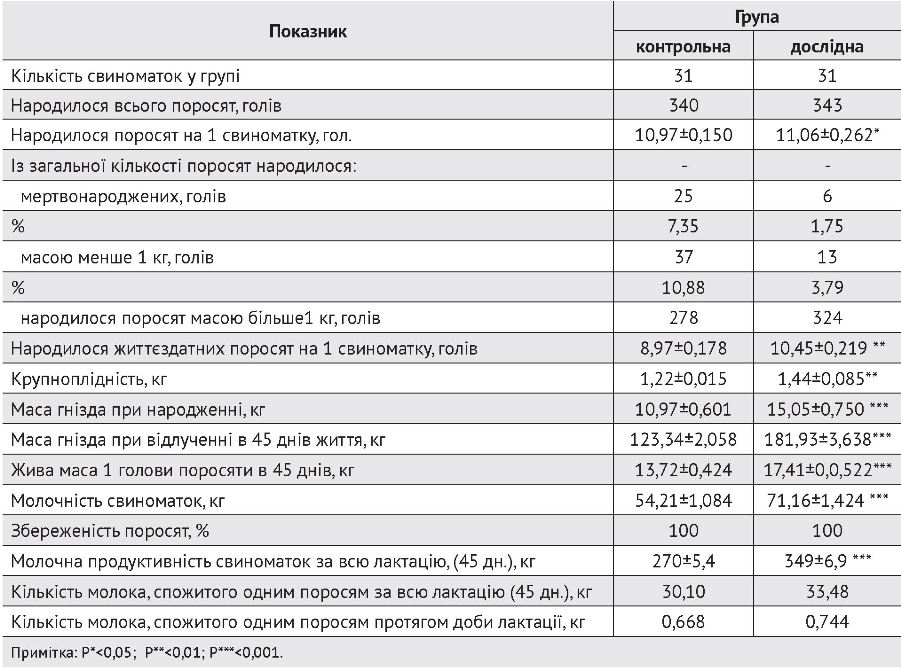 Отримані результати годівлі свиноматок із використанням удосконалених білково-вітамінно-мінеральних кормових добавок свідчать про їх перевагу над стандартними добавками: мертвонароджених поросят менше в дослідній групі на 5,6%; народжених масою нижче 1 кг — менше на 7,05%; народжених масою 1 кг і вище — більше на 16,54%; в кожному гнізді одержано додатково життєздатних поросят на 1 свиноматку — 1,45 голови і різниця маси гнізда при народженні на користь дослідної сягає +37,19%.