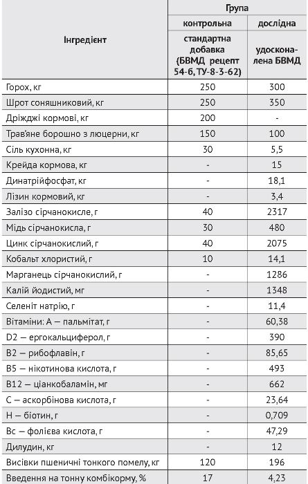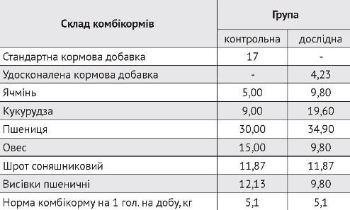 Для оптимізації раціону годівлі свиноматок дослідної групи до складу комбікорму додавали 4,23% балансуючої кормової добавки, виготовленої за удосконаленою рецептурою авторів (табл. 2).