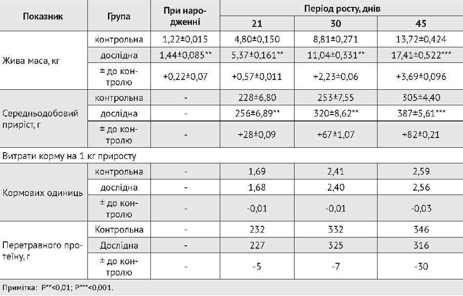 За період від народження до 45 днів життя жива маса однієї голови поросят дослідної групи зросла у 12 разів, тоді як у контрольні — в 11. Абсолютна жива маса однієї голови у першої була на 27% більше за рахунок вищого середньодобового приросту. Більша інтенсивність фізіологічних процесів сприяла підвищенню перетравності і засвоєнню поживних речовин раціону, що відобразилось у зменшенні витрат корму на одиницю приросту.