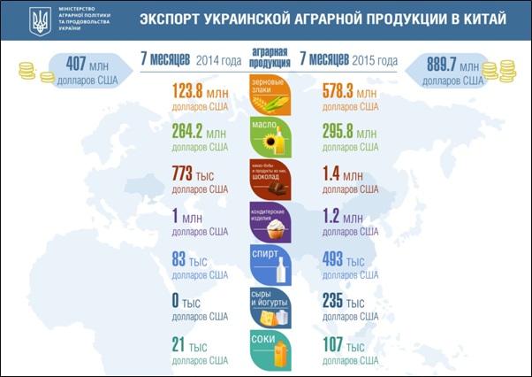Нагадаємо, у 2014 році товарообіг сільгосппродукції між Україною та Китаєм становив 931,9 млн дол., що на 36,6% більше, ніж за 2013 рік. А за 6 місяців цього року загальна сума аграрного товарообігу між країнами склала уже 832,4 млн дол., за зростанням на 84,3%.