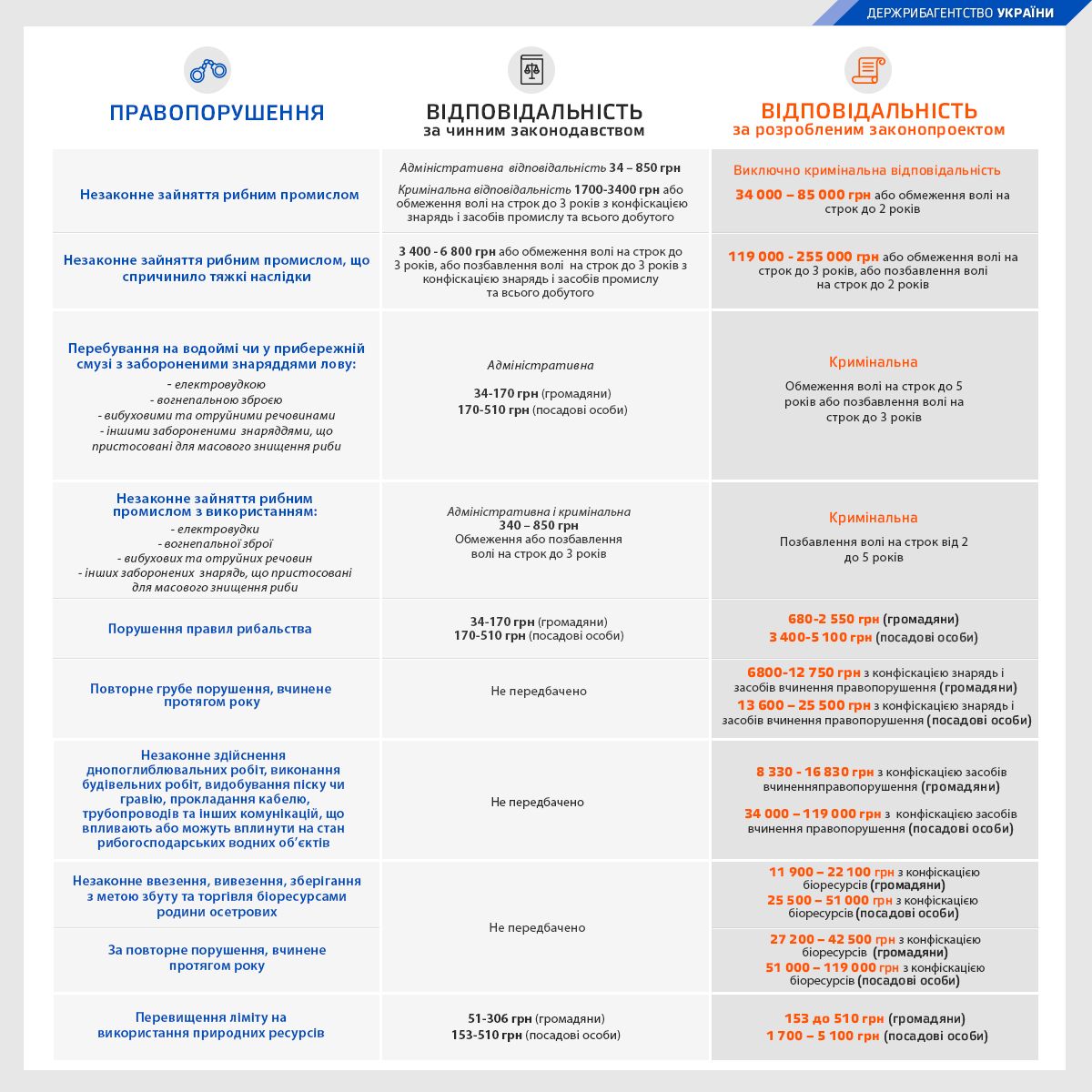 У Держрибагентстві зазначають, що порушення правил рибальства сьогодні здебільшого регулюється КУпАП, кримінальна відповідальність передбачена виключно за грубі порушення. Це також є проблемним аспектом чинного законодавства, оскільки у Законі відсутні чітко визначені критерії «грубих порушень», що дозволяє майже всі діяння кваліфікувати як адміністративні правопорушення.