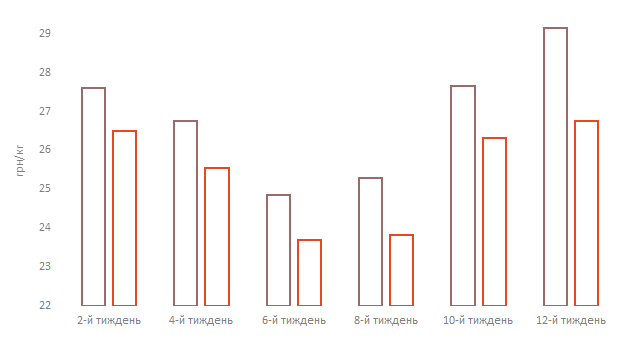 Динаміка середніх закупівельних цін на живець свиней І-ї та ІІ-ї категорії
