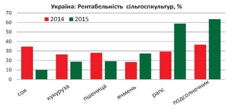 - найвища рентабельність вирощування соняшнику в 2015 році, порівняно з іншими культурами (63,4%);