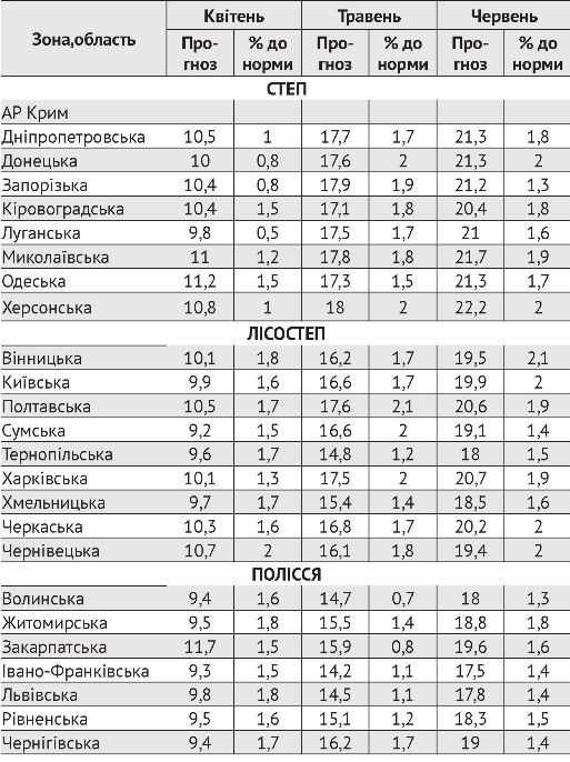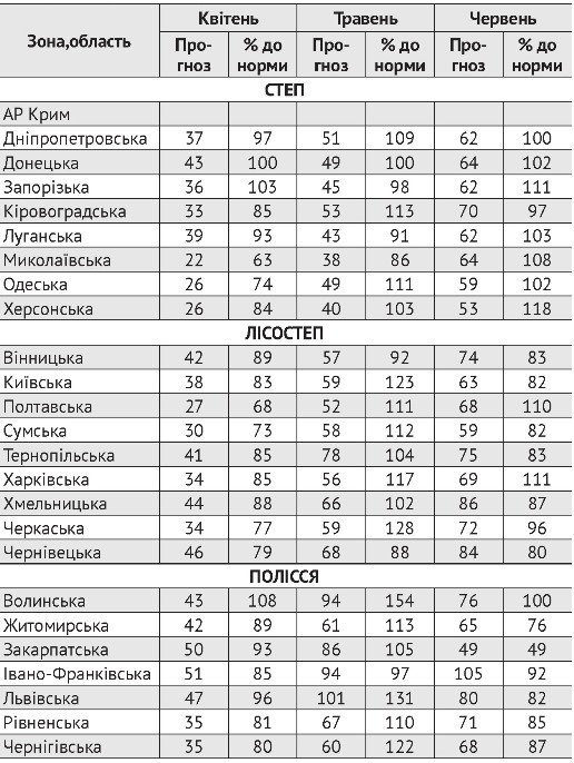 Місячна кількість опадів коливатиметься у межах 60–108% від середніх багаторічних показників у квітні, від 86 до 123% їх значень у травні та від 82 до 118 у червні.