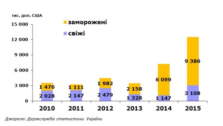 Експерти зазначають, що в 2015 році поставки свіжих ягід зросли в 1,5 разу - до 3,1 млн дол. У свою чергу поставки заморожених ягід зросли в 6,4 разу - до 9,4 млн дол. в 2015 році.