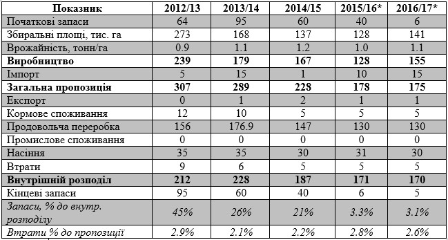 Основною причиною подорожчання культури експерти називають обмеженість пропозиції на внутрішньому ринку, яка й надалі продовжує скорочуватись. Ця пропозиція формується за рахунок початкових запасів, виробництва та імпорту. У 2015 році, за рахунок зменшення площ (-7%) та урожайності (-18%) валовий збір склав всього 128 тис. тонн (-24%), що є найнижчим показником за часів незалежності України. Попри наявність перехідних залишків та імпорт, пропозиція на ринку за підсумками року є нижчою, ніж потребує ринок. Схожа ситуація мала місце в 2010/11 маркетинговому році.