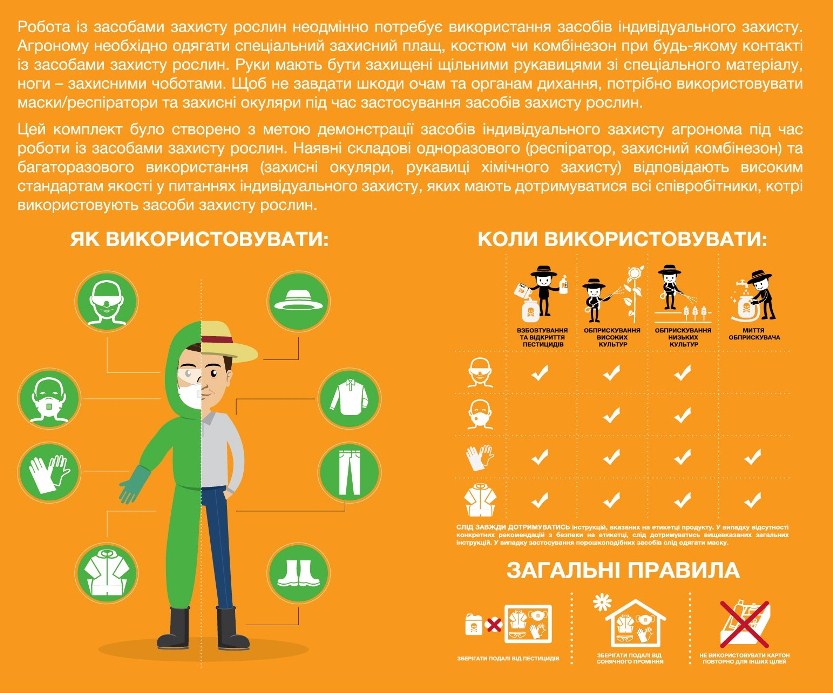 Кожен набір складається з предметів одноразового (респіратор, захисний костюм) та багаторазового використання (захисні окуляри, рукавиці хімзахисту), що відповідають найвищим стандартам якості. Спеціальний костюм захищає агронома і його одяг від пилу і бризок і завдяки наявності паровідвідних вставок убезпечує від перегріву. Щільні рукавиці винятково зносостійкі та здатні уберегти руки від агресивних хімікатів. Окуляри призначені для захисту очей від летючих частинок, потрапляння рідини та ультрафіолетового випромінювання, респіратор убезпечить органи дихання.